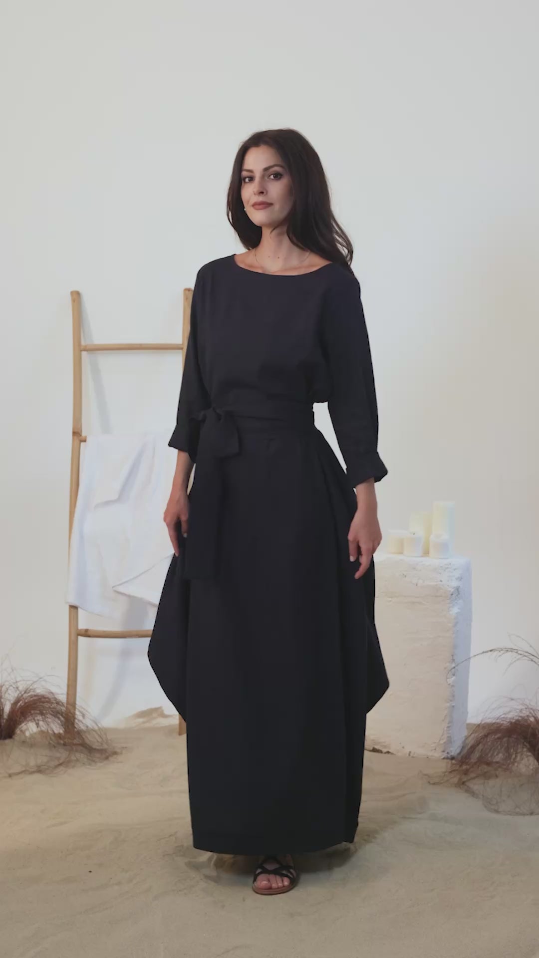 Loose Linen Maxi Dress with Bracelet Sleeves and Belt