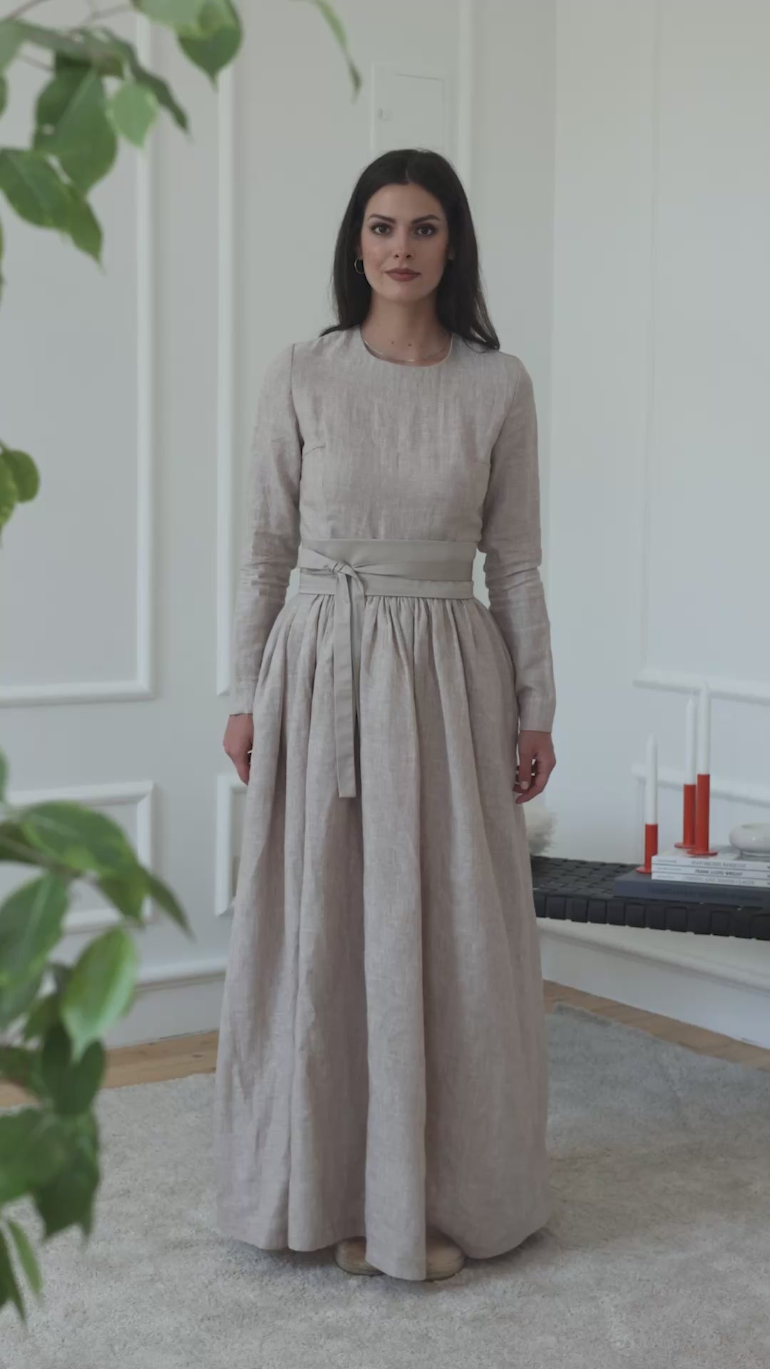 Linen Maxi Dress with Long Sleeves and Wide Tie Belt